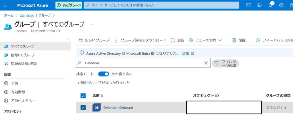 具体的な手順は割愛しますが、今回は、AzureAD参加するWin11端末のホスト名の一部の文字列が含まれる場合、AzureAD参加後に自動でWin11端末がグループ登録されるような「Defender_Onboard」という名前の動的セキュリティグループ(デバイスグループ)を作成しています。