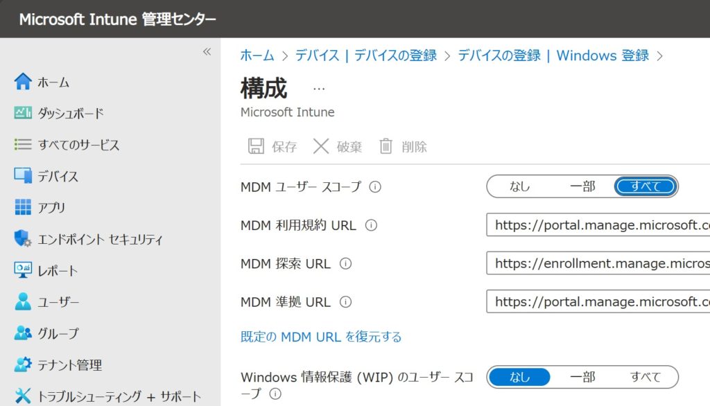 ※本設定で、全ユーザーにMDMの自動登録が許可されるようになる。ユーザーがWin11端末をAzureAD参加させたタイミングでIntuneにも自動で端末がMDM登録されるようになる。